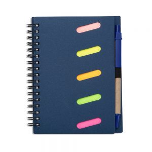Bloco de anotações ecológico com caneta reciclável e autoadesivos. Capa kraft com detalhes vazados, possui cinco blocos autoadesivos coloridos com aproximadamente 20 folhas, aproximadamente 70 folhas brancas pautadas com símbolo ecol��gico na parte inferior. Acompanha caneta de papelão com detalhes em plástico.
