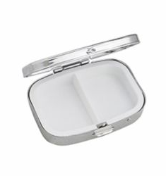 PORTA COMPRIMIDO DE METAL COM BOTÃO PARA ABRIR, NA COR PRATA E COM 3 DIVISÓRIAS.