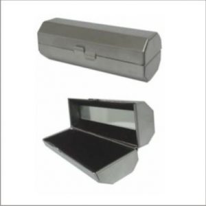 Porta batom em couro sintético prata com plaquinha de metal frontal com botão para abrir/fechar, possui um espelho interno.
