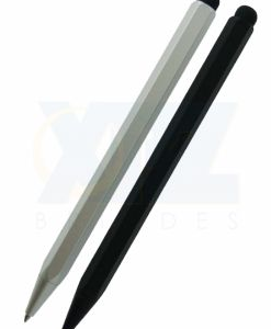 Caneta de metal com clip plástico e ponta para teclados touchscreen.