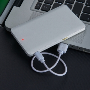 Power bank plástico com capacidade de 2300 mAh. Com um design fino, seu material plástico é texturizado e lembra a elegância de um couro.