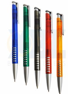 Caneta Plástica Atacado inteira prata com detalhes coloridos. Possui clip de metal com detalhe plástico colorido, parte inferior colorida emborracha. Aciona por clique.