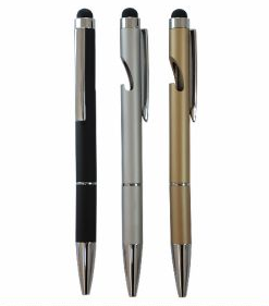 Caneta esferográfica com ponta para touchscreen, e corpo com abridor de garrafas.