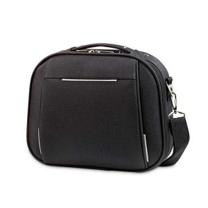 Mala de cosméticos. 600D e EVA. Compartimento frontal semi-rígido. Interior forrado, com 2 bolsos. Alça para transporte em trolley. 300 x 250 x 105 mm