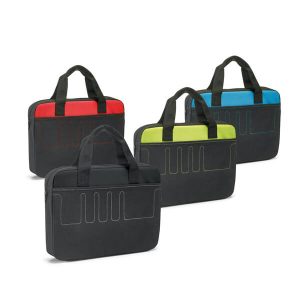 Pasta para notebook. 600D2Tone e 300D. Compartimento para notebook 14”. Interior forrado e almofadado. Alça de ombro e alça para transporte em trolley. 400 x 300 x 80 mm