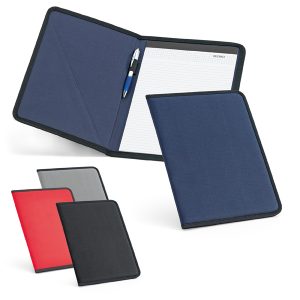 Pasta A4. C. sintético e 800D poliéster. Interior em microfibra. Bloco: 20 folhas pautadas. Esferográfica não inclusa. 245 x 315 x 15 mm