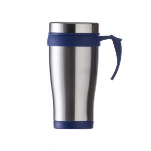Caneca inox 400 ml com pegador e parte inferior plástica colorida. Tampa rosqueável, possui compartimento que pode ser aberto para beber(não é térmica).