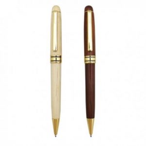 Caneta de madeira com detalhes dourados. Possui clip e anel dourado em metal e anel central com detalhes preto. Aciona por giro.
