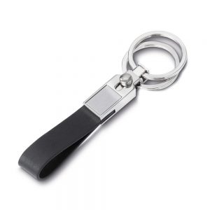 Chaveiro de metal com couro sintético preto com 2 argolas + caixa com berço aveludado Medida: 128mm x 35mmø Peso Unidade: 54g Caixa: 250 pçs Display: 50 pçs Medidas da Caixa: 49x37x30 Peso caixa: 15,00 kg