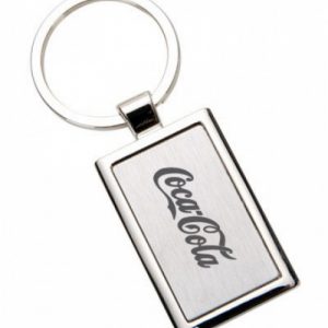 Chaveiro retangular de metal. Embalagem, caixinha preta.