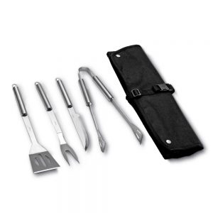 KIT CHURRASCO Kit Churrasco com 4 peças em Inox e Avental em lona M. Avental: 390mmX27mmX2mm Peso Unidade: 746Gr Caixa: 12 pçs Medidas da Caixa: 47×43,5×17,5 Peso caixa: 10,50Kg