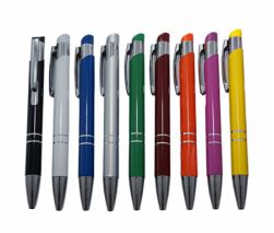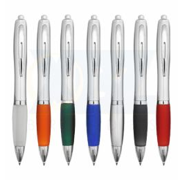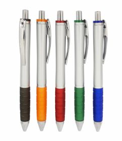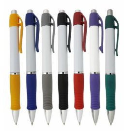 Caneta de plástico com detalhe emborrachado. Tamanho total: 13,5 cm x 3,6 cm Peso do produto: 11 g