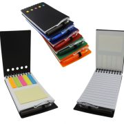 Bloco de anotações com post-its coloridos, estojo de plástico.