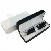 Kit com caneta e lapiseira de metal em estojo de acrílico transparente.